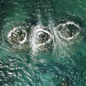 在一方清池中,趵突泉的三股泉水噴涌歡騰(無(wú)人機(jī)拍攝)。(新華社記者徐速繪攝)