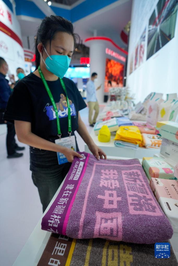 9月20日,在第七屆中國-亞歐博覽會上,參展商在整理由阿拉爾市所產(chǎn)的棉花加工而成的毛巾制品。