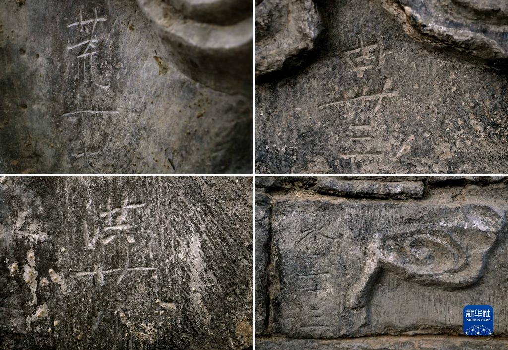 這是巨幅石雕祥瑞壁畫上的編碼,在宋代砌筑時起到防止壁畫錯亂的作用(拼版照片,9月21日攝)。新華社記者 李安 攝