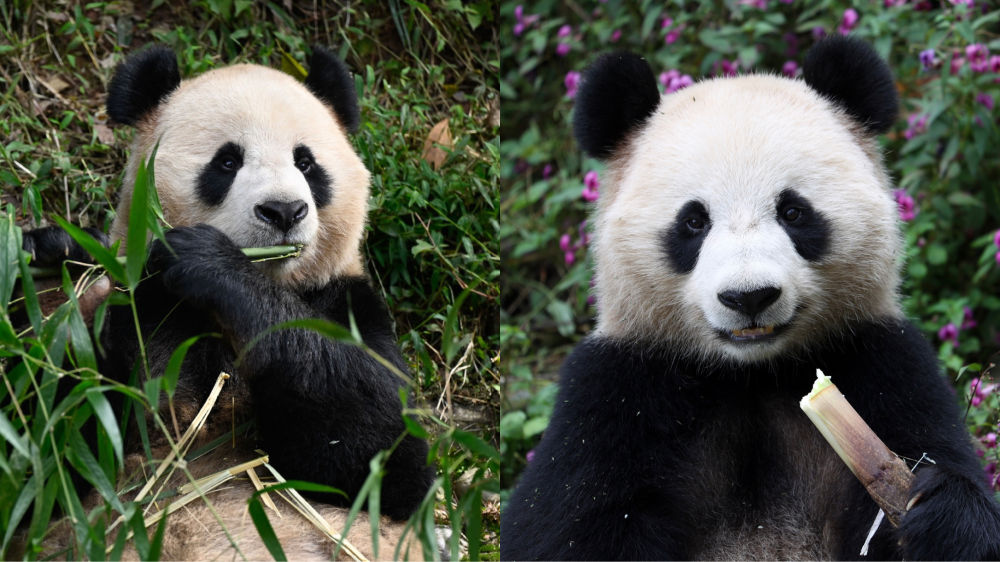 此為拼版圖片。10月17日,在中國大熊貓保護(hù)研究中心雅安基地,大熊貓“京京”(左)和“四海”在吃竹子。左圖新華社記者胥冰潔攝,右圖新華社發(fā)(陳居偉攝)。