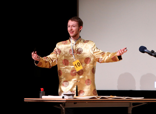 2015年3月21日,第14屆“漢語(yǔ)橋”世界大學(xué)生中文比賽全英大區(qū)中,選手康可表演創(chuàng)意書法。新華社記者韓巖攝
