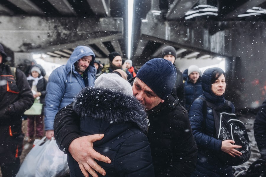 2022年3月8日,一對情侶在烏克蘭伊爾平告別。(新華社發,迭戈·埃雷拉攝)