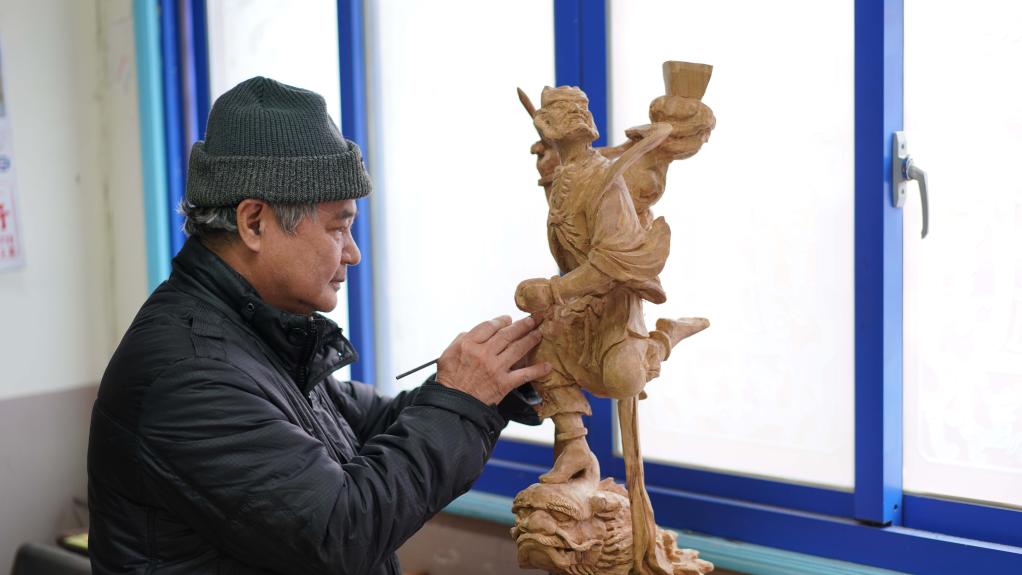 臺(tái)灣彰化鹿港的木雕匠人李秉圭為一尊木雕造像修飾細(xì)節(jié)(2月3日攝)。新華社記者 黃揚(yáng) 攝