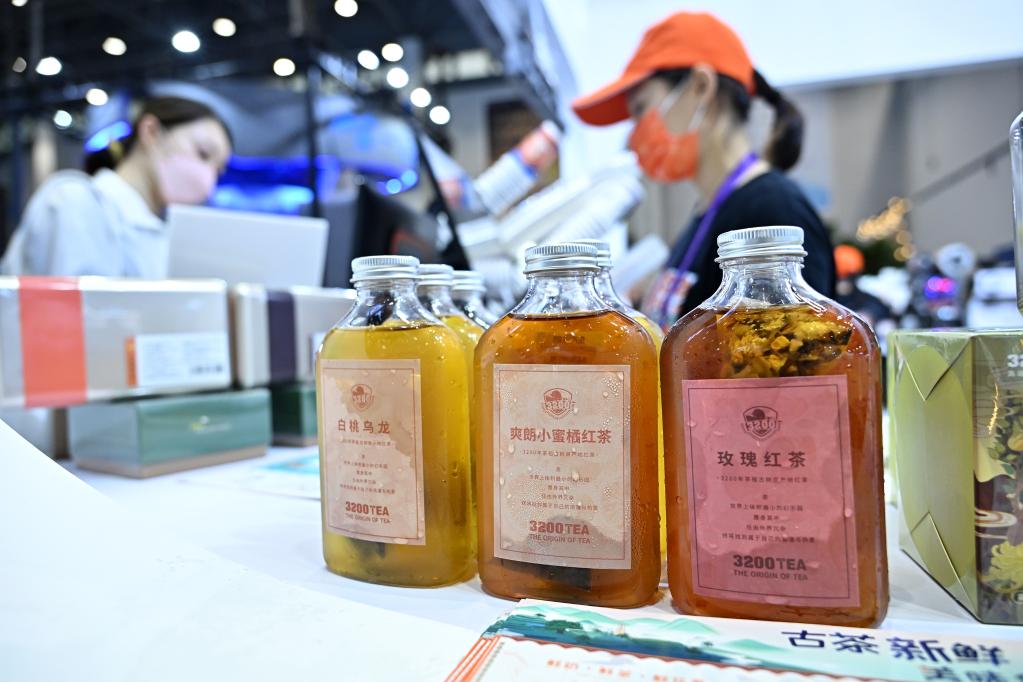 4月12日,消費(fèi)者在消博會上了解茶飲。新華社記者李鑫攝