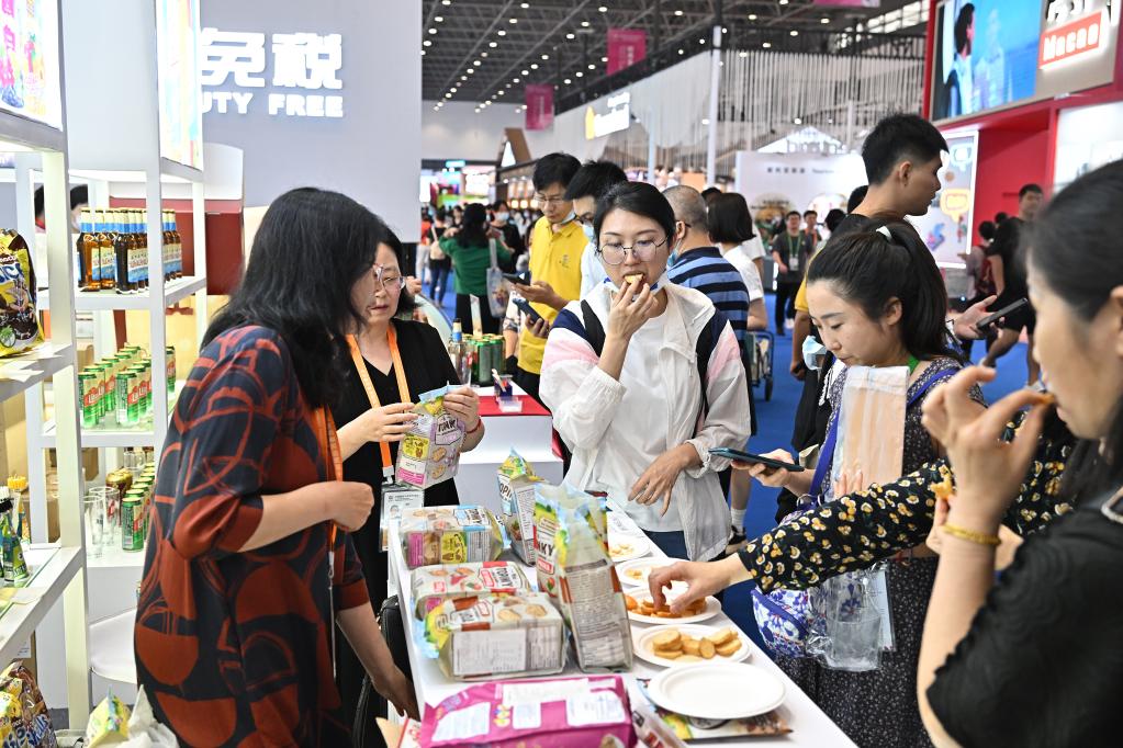 4月12日,參觀者在消博會捷克展臺品嘗面包干。新華社記者李鑫攝