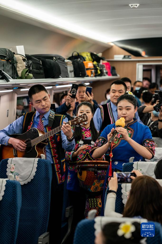 4月13日,乘坐首發列車的旅客在車上欣賞歌舞表演。新華社記者 胡超 攝