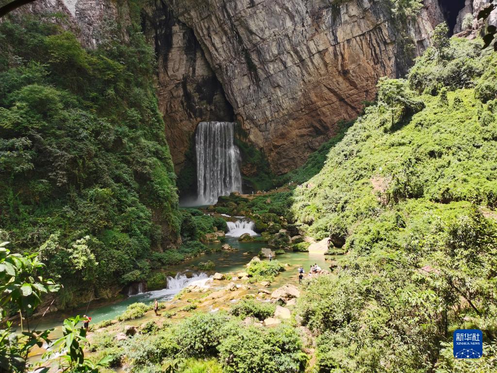 兩名游客在貴州省清鎮市羊皮洞瀑布下方的水潭里游泳(2022年8月11日攝)。新華社記者 鄭明鴻 攝