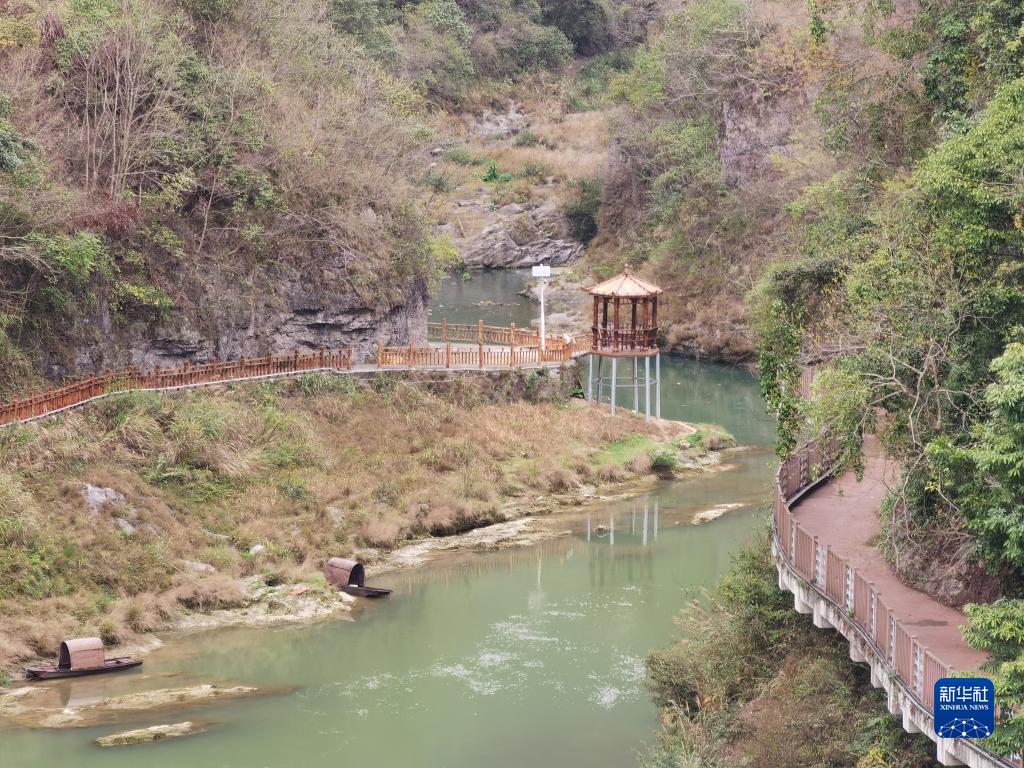 游客在正在升級改造的貴州省開陽縣香火巖瀑布景區內逗留(2023年3月18日攝,手機照片)。新華社記者 向定杰 攝