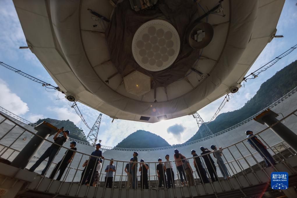 7月26日,專家在“中國天眼”饋源艙前進行現場考察(維護保養期間拍攝)。新華社記者 歐東衢 攝
