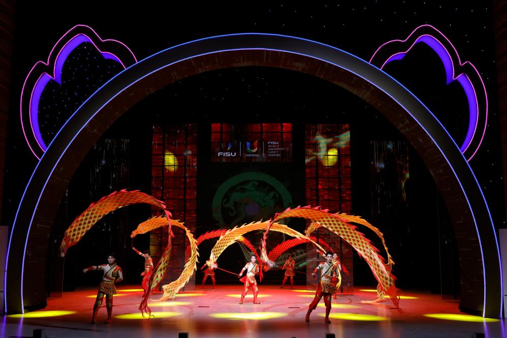 8月6日,來自成都體育學院的演員在表演《獅躍龍騰》。新華社記者 沈伯韓 攝