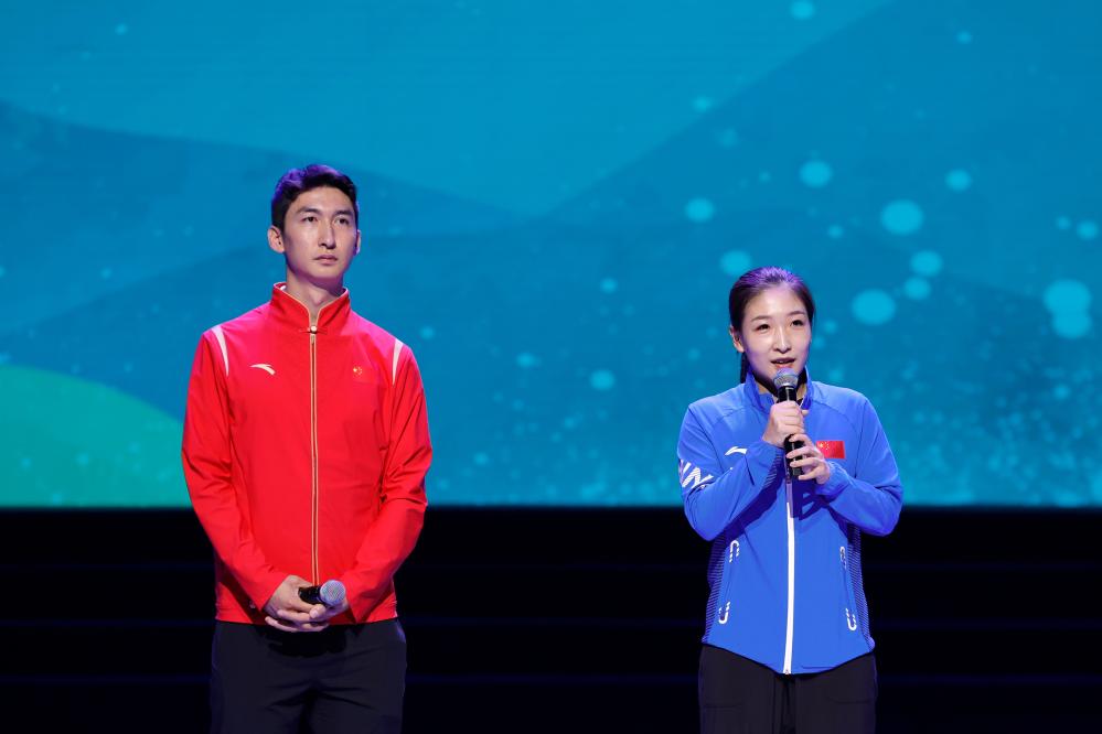 在優秀運動員交流環節,奧運冠軍武大靖和劉詩雯向在場的大學生運動員回顧了自己運動生涯的難忘時刻。武大靖表示,每當站上賽場,為國爭光的榮譽感都激勵著自己全力拼搏。劉詩雯表示,頑強拼搏和團結協作是中國乒乓球隊的優秀傳統,也為中華體育精神增添了光彩。兩人還鼓勵大學生運動員通過成都大運會更好地感受中國文化的精彩。