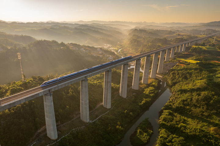 8月31日,一列動車組在晨曦中經過位于貴州省獨山縣郊外的貴南高鐵銀坡河特大橋(無人機照片)。新華社記者 劉續 攝