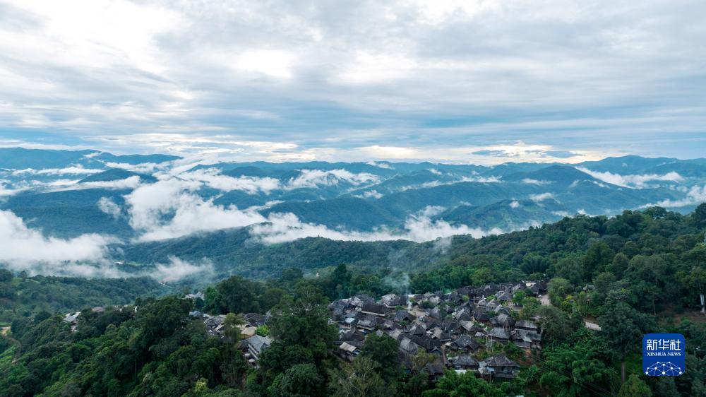 被山林與茶園環繞的景邁山翁基古寨一景(無人機照片,9月17日攝)。新華社記者 胡超 攝