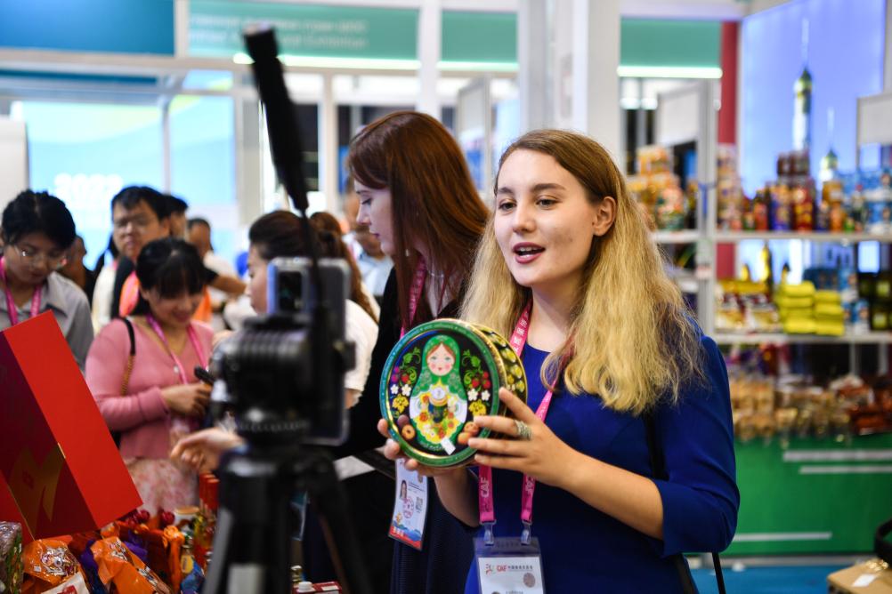 9月19日,外國參展商在楊凌農高會展臺進行直播。新華社記者 張博文 攝