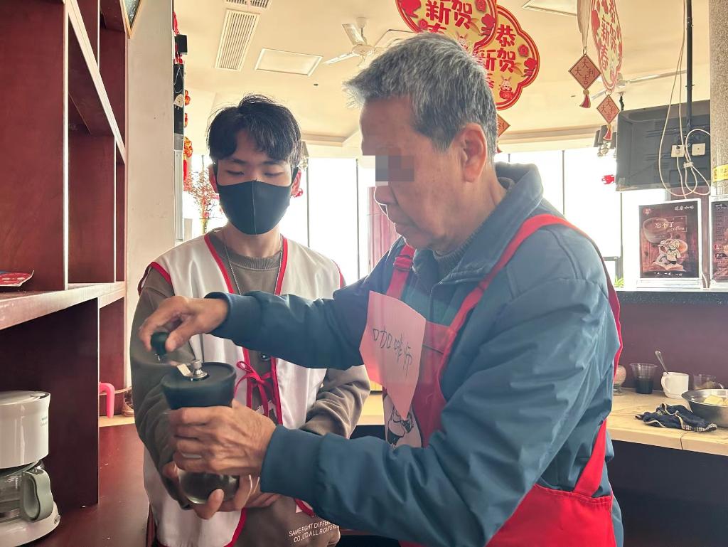 2023年3月21日,認知癥老人在醫務社工的協助下制作咖啡。