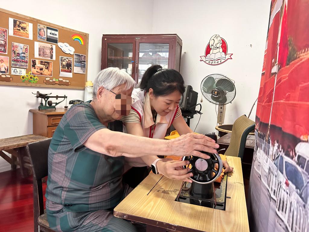 2023年8月7日,在“忘不了懷舊角”,醫務社工協助認知癥患者使用縫紉機。