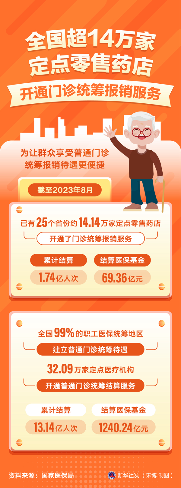 新華社北京9月22日電(記者彭韻佳、沐鐵城)為讓群眾享受普通門診統籌報銷待遇更便捷,截至今年8月,已有25個省份約14.14萬家定點零售藥店開通了門診統籌報銷服務,累計結算1.74億人次,結算醫保基金69.36億元。