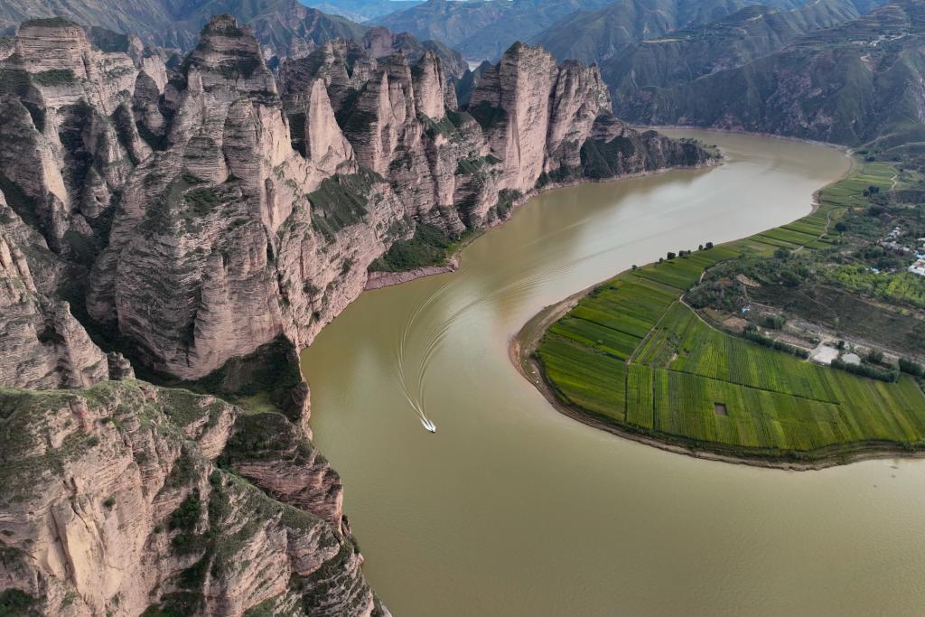 這是9月20日拍攝的炳靈寺石窟周圍黃河及石林風(fēng)光(無人機(jī)照片)。新華社記者 郎兵兵 攝