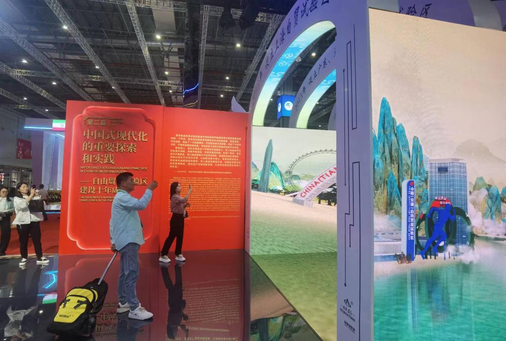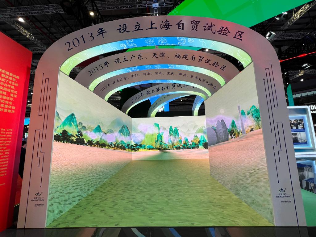 這是正在國家會展中心(上海)舉辦的第六屆中國國際進口博覽會國家綜合展的一個特別部分“中國式現代化的重要探索和實踐——自由貿易試驗區建設十年成就展”。它位于中國國家館內,通過高清視頻、珍貴照片、實物模型等,講述中國各地自貿試驗區建設的改革開放故事。