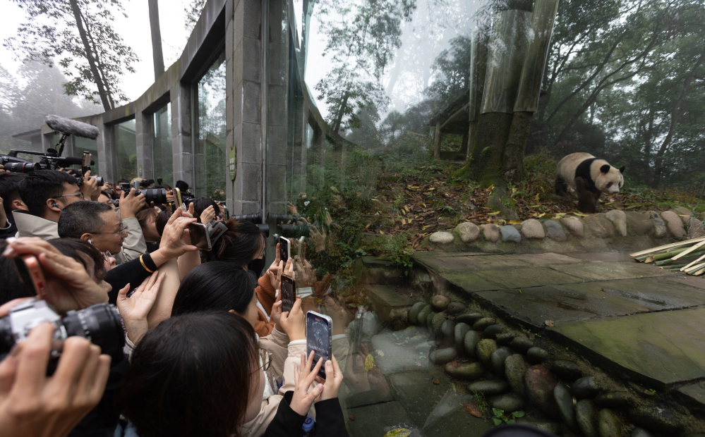 四川雅安碧峰峽,日本大熊貓攝影師高氏貴博在人群中踮起腳尖,和一同來探望“香香”的日本粉絲們等待著。當嬌憨的“香香”現身林間時,他高舉相機、按下快門,成就他拍攝大熊貓的3371天。