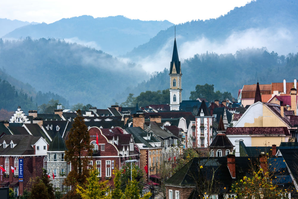 從成都往西北,驅車一個多小時,就能到達有“天府金彭、蜀漢名區”之稱的彭州市。再從彭州一路向北,駛入35公里的大山深處,闖入眼簾的,竟是一座滿是彩色尖頂房子和精巧法式陽臺的小鎮,感覺像是從彭州穿越到了歐洲。