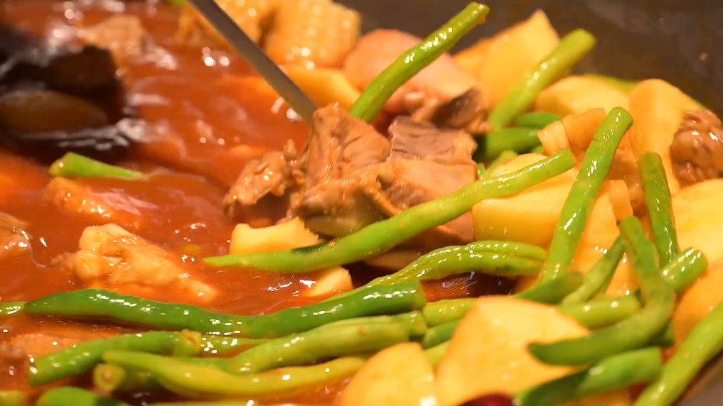 半米的大鐵鍋,似乎能裝下整個世界——雞翅、土豆、排骨、牛腩、玉米等等等等,各種食材一股腦兒地倒進去,萬物皆可鐵鍋燉。