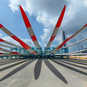 一批風電葉片在江蘇鹽城港射陽港區碼頭等待運輸(2023年9月8日攝,無人機照片)。新華社記者李博攝