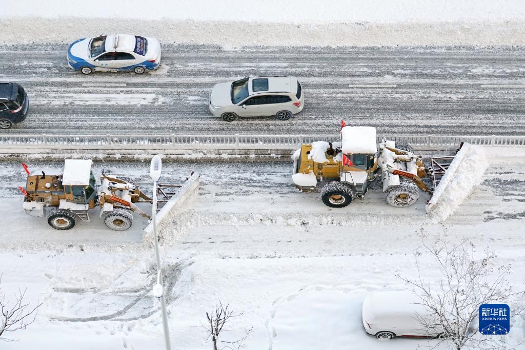 12月21日, 大型機械在山東省煙臺市街頭清理道路積雪。新華社發(fā)(唐克攝)