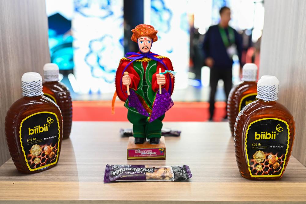 11月8日在第六屆進博會上拍攝的尼加拉瓜蜂蜜產品。新華社記者 張可任 攝