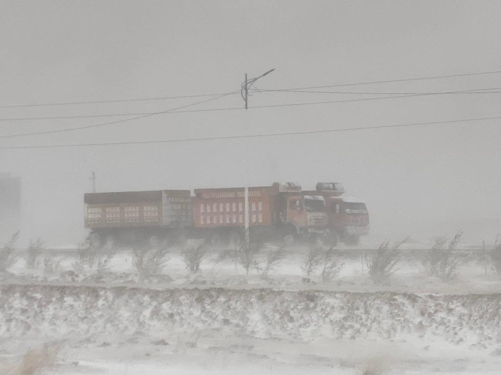 5月20日,在蒙古國蘇赫巴托爾省,貨車在暴風雪中行駛。新華社發(蒙古國蘇赫巴托爾省BBS電視臺供圖)