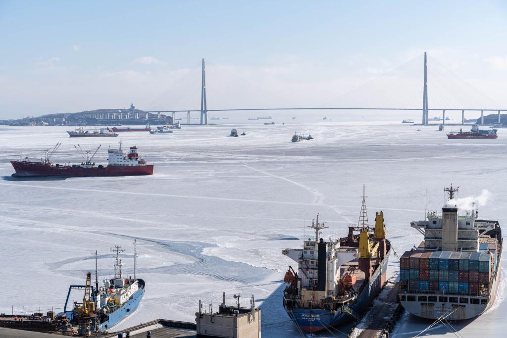 這是2023年1月24日拍攝的俄羅斯符拉迪沃斯托克金角灣冰凍的海面。新華社發(郭飛洲 攝)