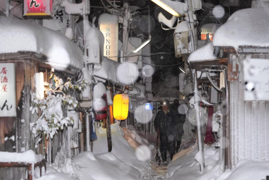 2022年12月23日,行人在日本石川縣金澤市冒雪前行。新華社/共同社