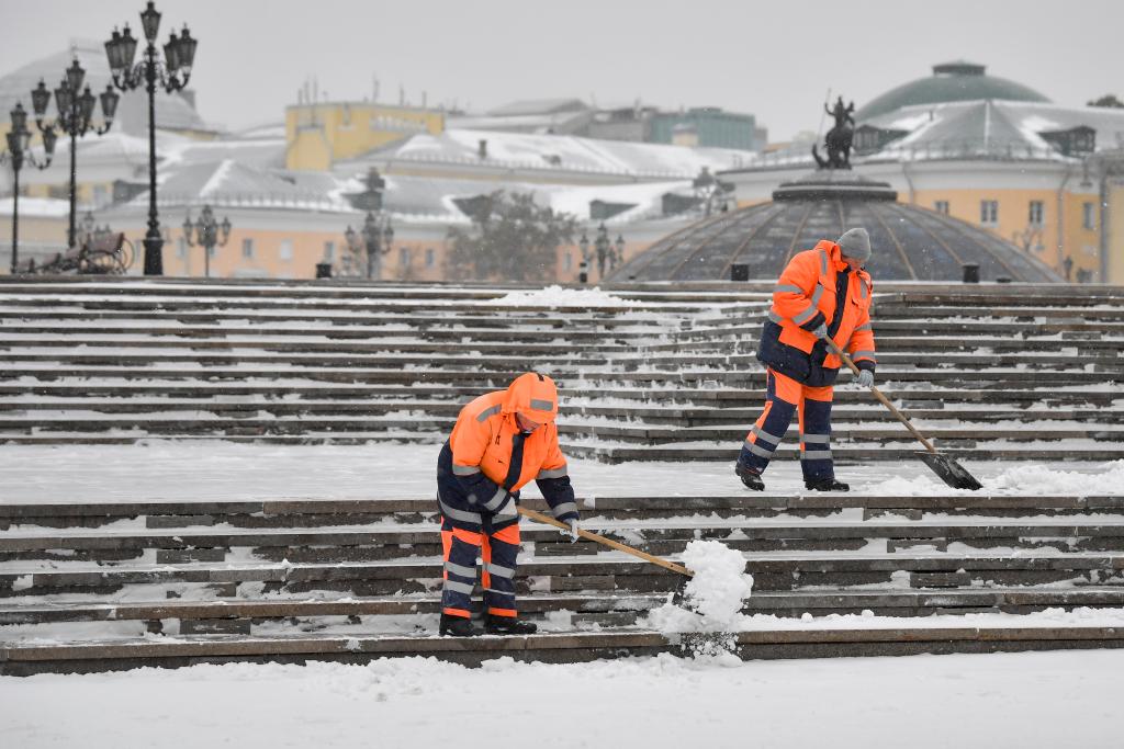 2023年10月27日,在俄羅斯首都莫斯科,工人清理臺階上的積雪。新華社發(亞歷山大攝)