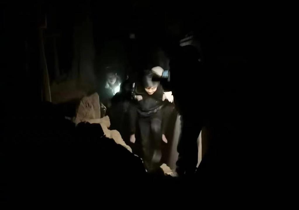 12月19日凌晨,大河家鎮派出所輔警徐鵬和同事們從廢墟中救出一名老人。(大河家鎮派出所供圖)