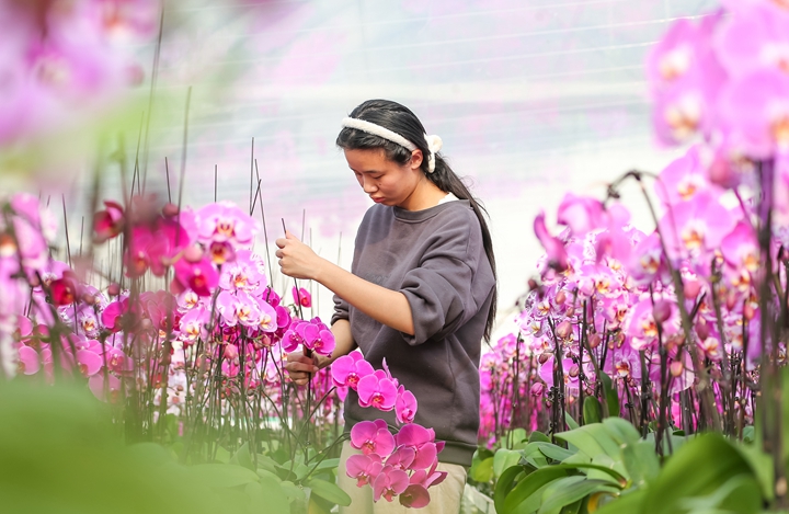 1月4日,在江苏省镇江句容市茅山镇前陵村蝴蝶兰种植基地,花农在管护花卉。新华社发(钟学满 摄)