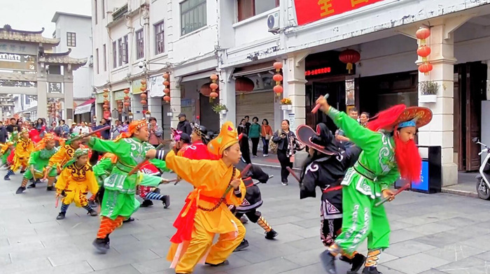 广东潮州,英歌舞巡游来到牌坊街。新华网发(潮州市委宣传部供图)