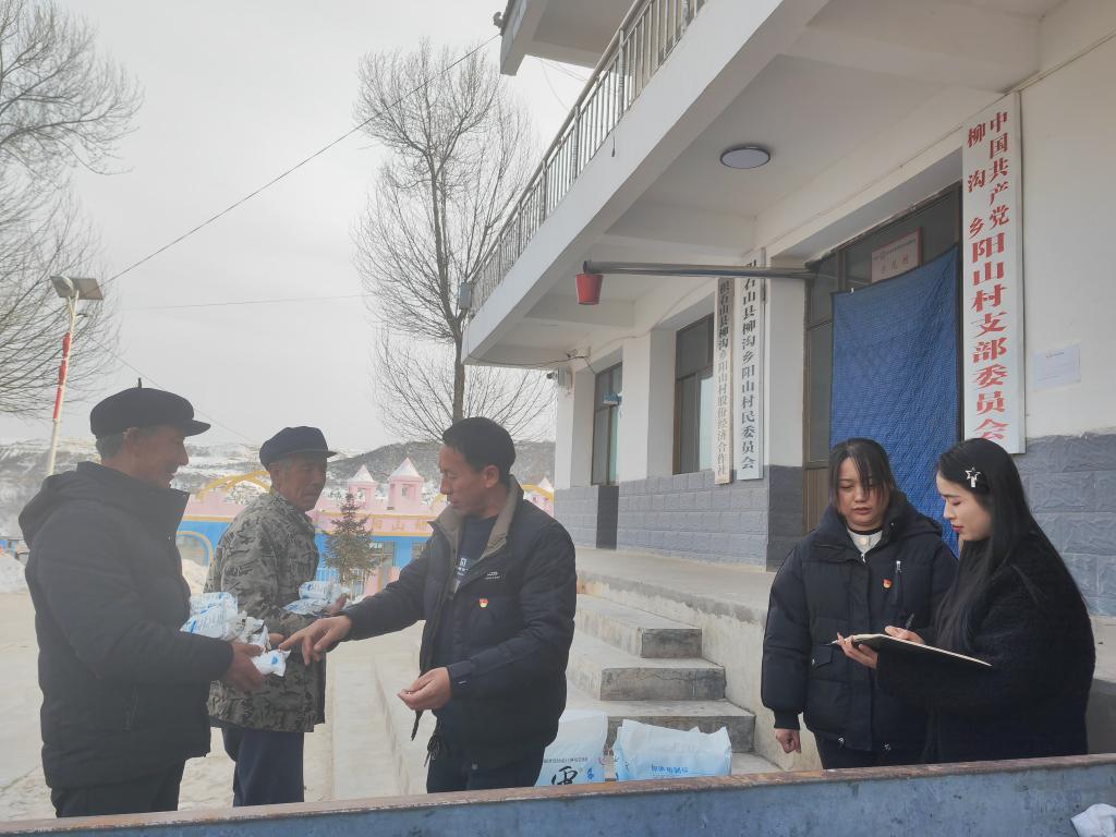 春节期间,白文英(右二)、赵永和(右三)与赵怀杰(左一)给村民发放物资。新华社记者 崔翰超 摄