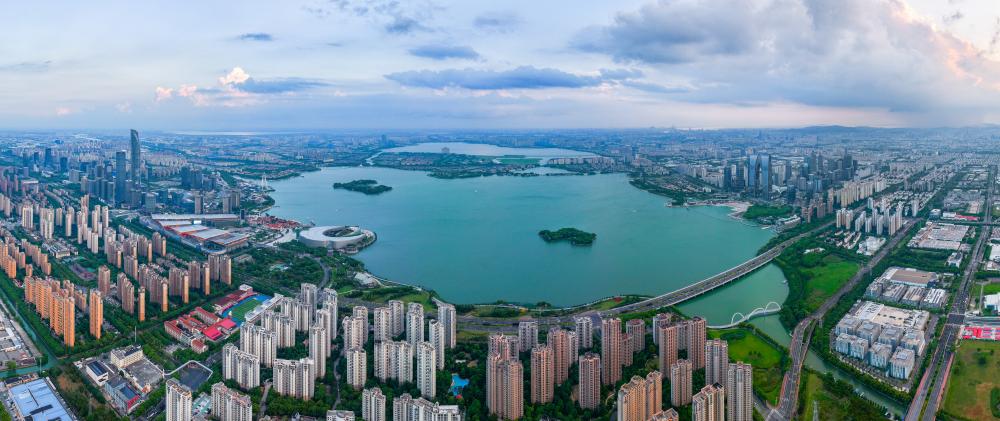 金鸡湖的喷泉已擎起彩虹