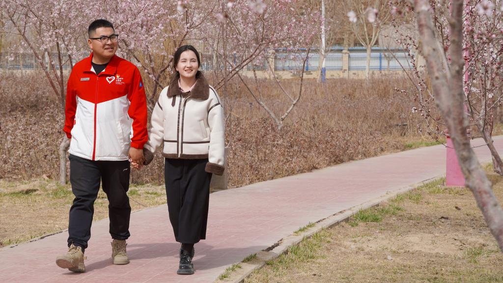 徐灿(左)与女友古丽苏姆·艾合麦提在公园散步。新华社记者 高晗 摄