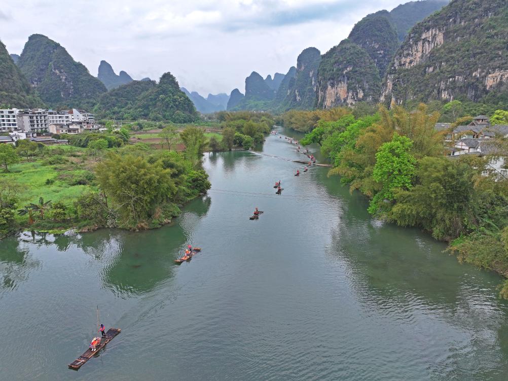 游客在春光宜人的广西桂林市阳朔县遇龙河上漂流(2024年3月29日摄,无人机照片)。新华社记者 周华 摄要拍兴坪古镇