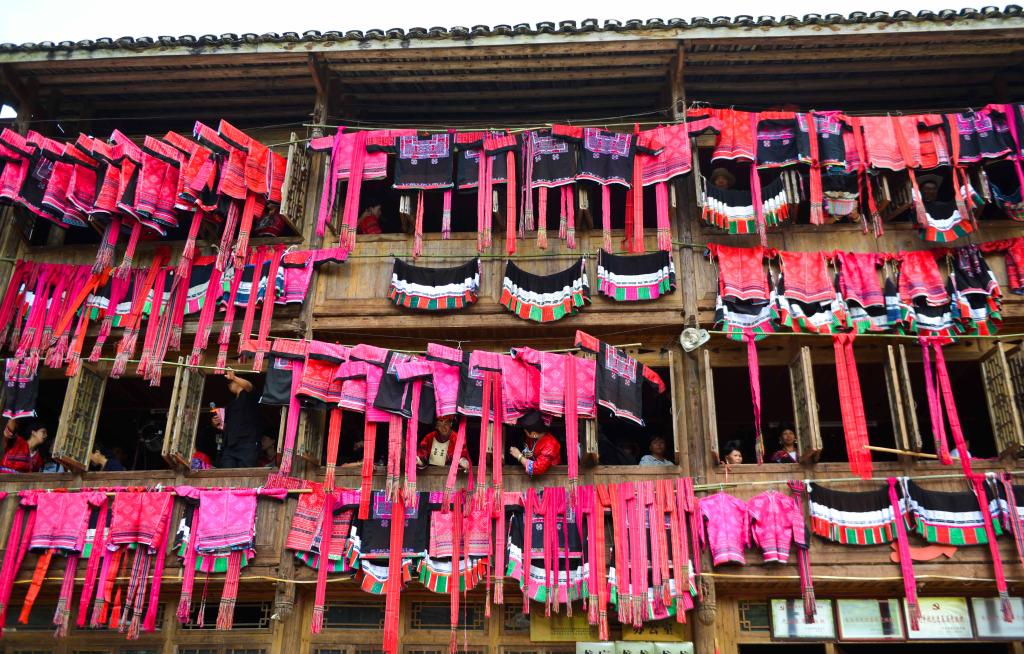 2018年7月18日,在广西桂林市龙胜各族自治县龙脊镇大寨村,瑶族妇女在吊脚楼上晾晒花衣花裙。新华社发(潘志祥 摄)亿年的地质史诗