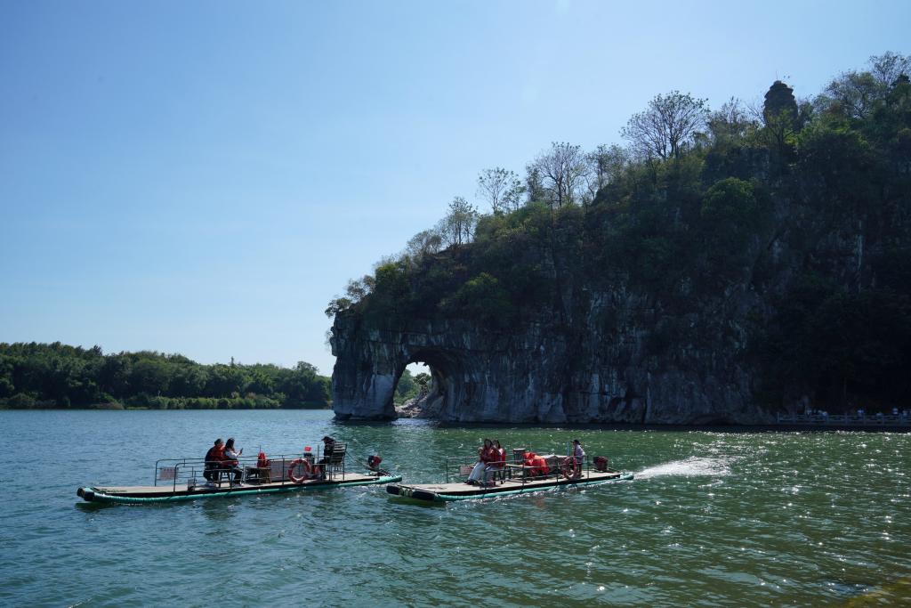 2024年10月25日,游客在广西桂林市象鼻山景区乘船游玩。新华社记者 马宁 摄