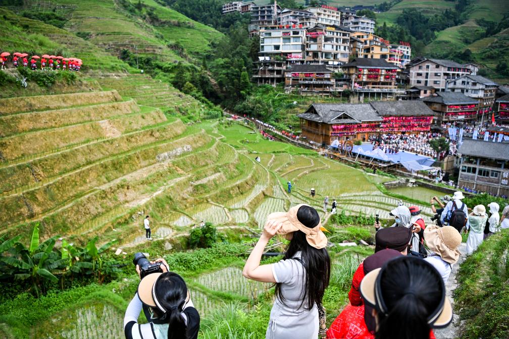 2024年7月11日,游客在广西桂林市龙胜各族自治县龙脊镇大寨村参加当地传统“晒衣节”。新华社记者 曹祎铭 摄