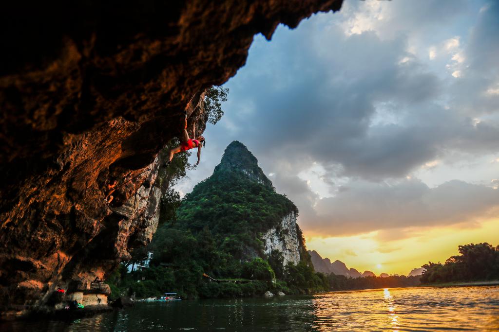 2022年9月7日,攀岩爱好者在广西桂林市阳朔县进行深水抱石。新华社记者 曹祎铭 摄要拍黄洛瑶寨