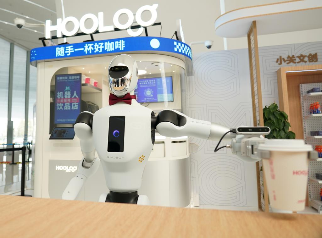 3月26日,在中关村国际创新中心,一款盖博特机器人在为“顾客”送咖啡。新华社记者 张晨霖 摄