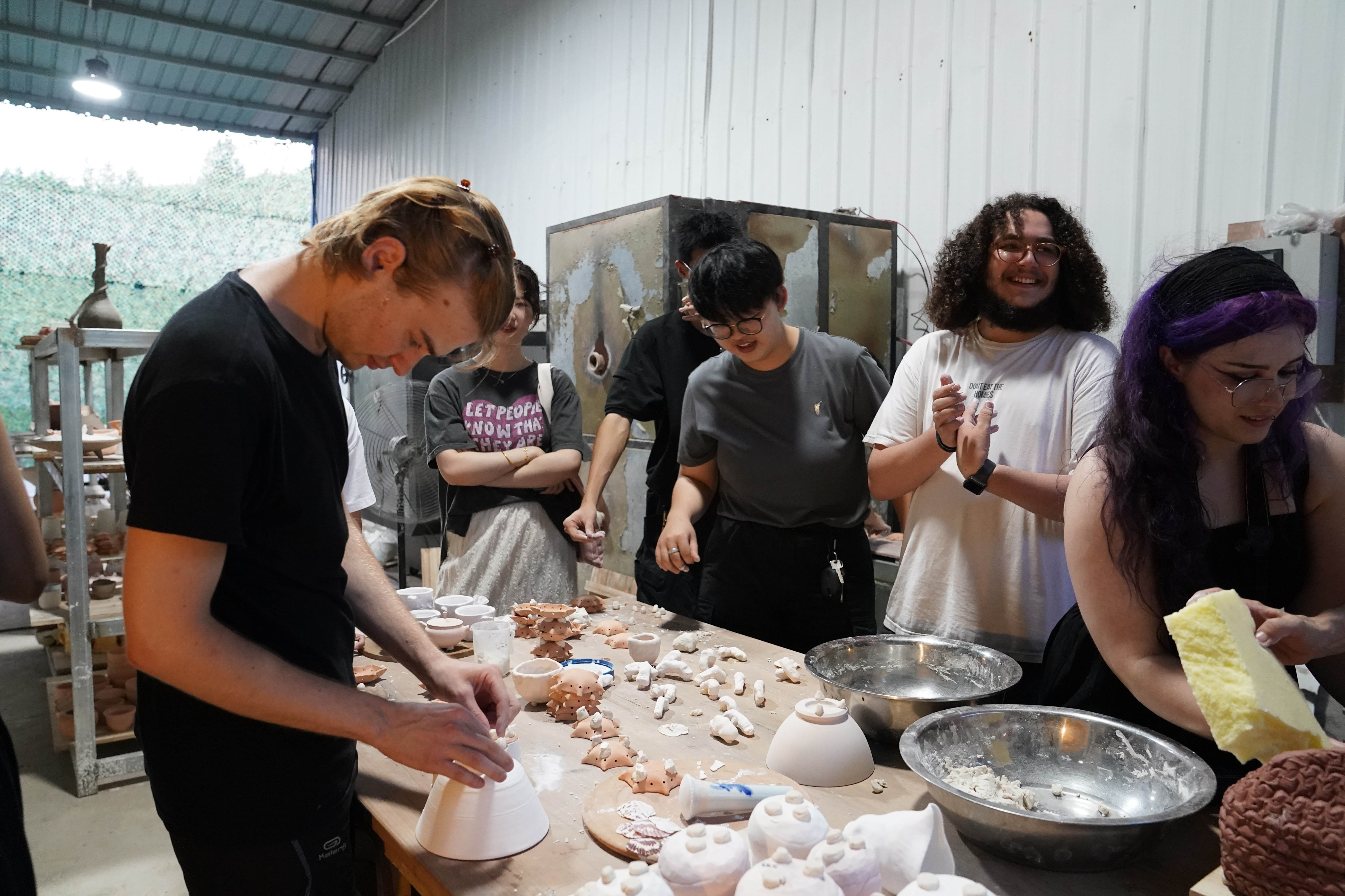 2024年7月17日,参观者在江西景德镇陶瓷大学的一处窑炉旁一起创作、讨论。新华社记者 周密 摄