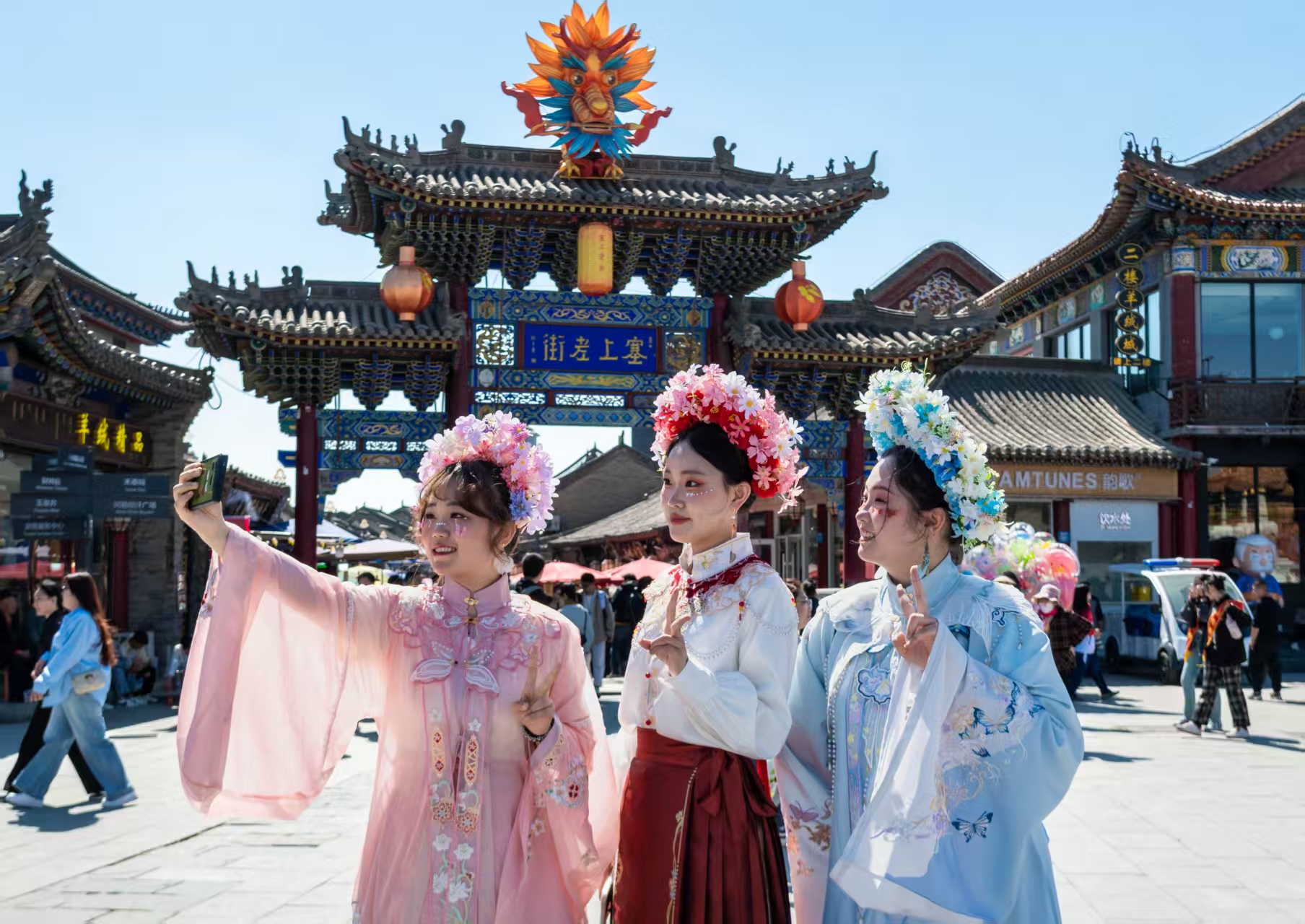 游客们在内蒙古自治区塞上老街历史文化街区内拍摄写真。呼和浩特市玉泉区融媒体中心供图