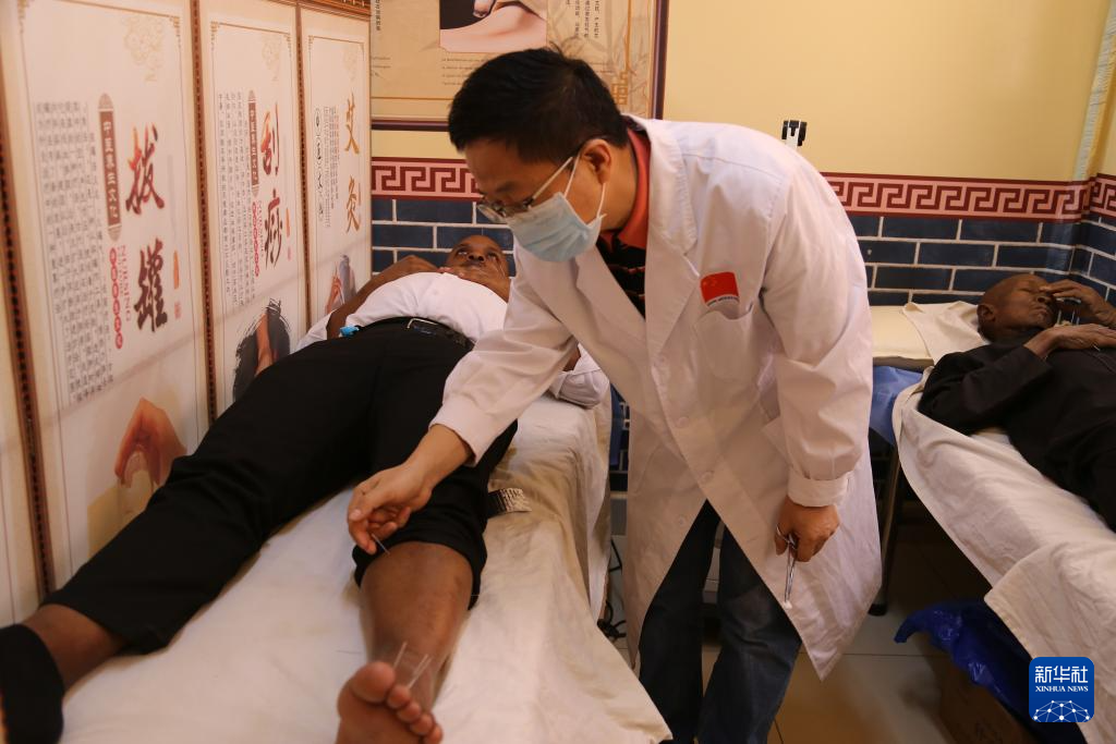 3月26日,在尼日尔综合示范医院,中医诊疗中心副主任医师王庆武为患者进行针灸治疗。新华社记者 司源 摄