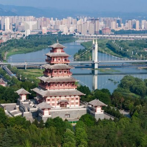 从高处俯瞰,陕西宝鸡城沿着三层巨大的“U形阶梯”徐徐展开:南有秦岭山脉拔地而起;中间,渭河自西向东穿城而过,铺开一道宽阔的水廊;北边,隆起的黄土台塬平坦开阔,沉稳如磐。