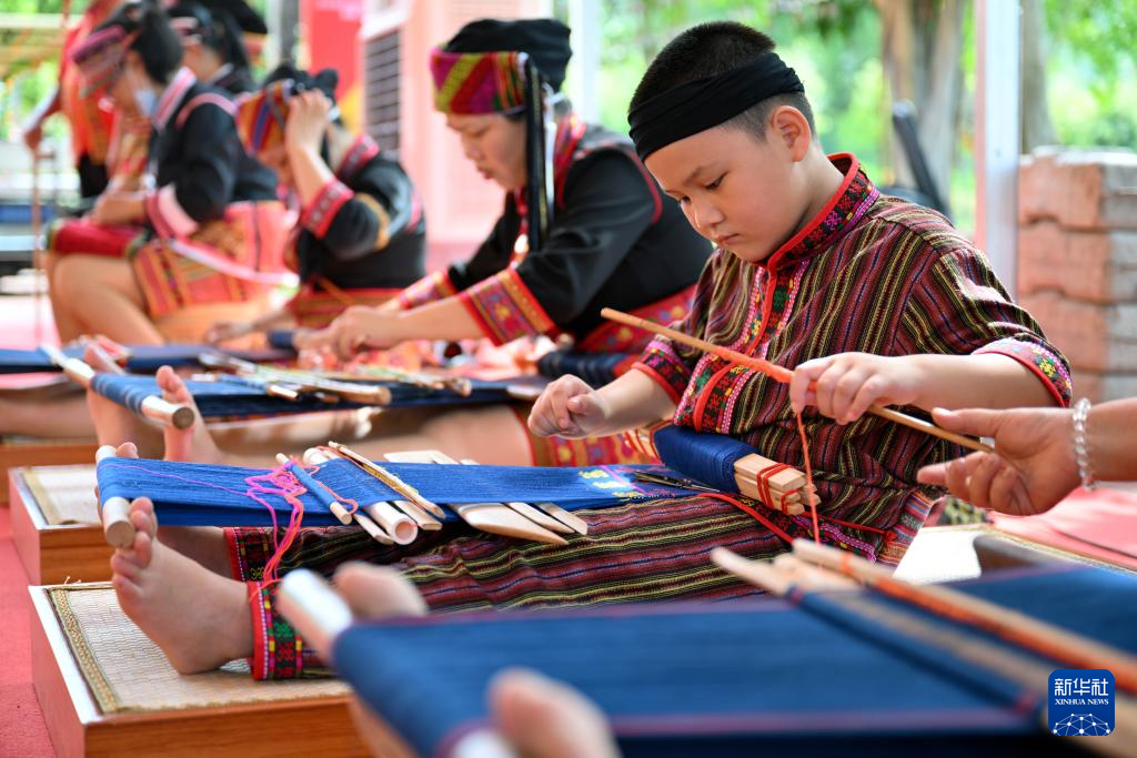 2022年6月11日,一名来自五指山市的黎族小朋友在三亚南山非遗节展示黎族织锦技艺。新华社记者 郭程 摄